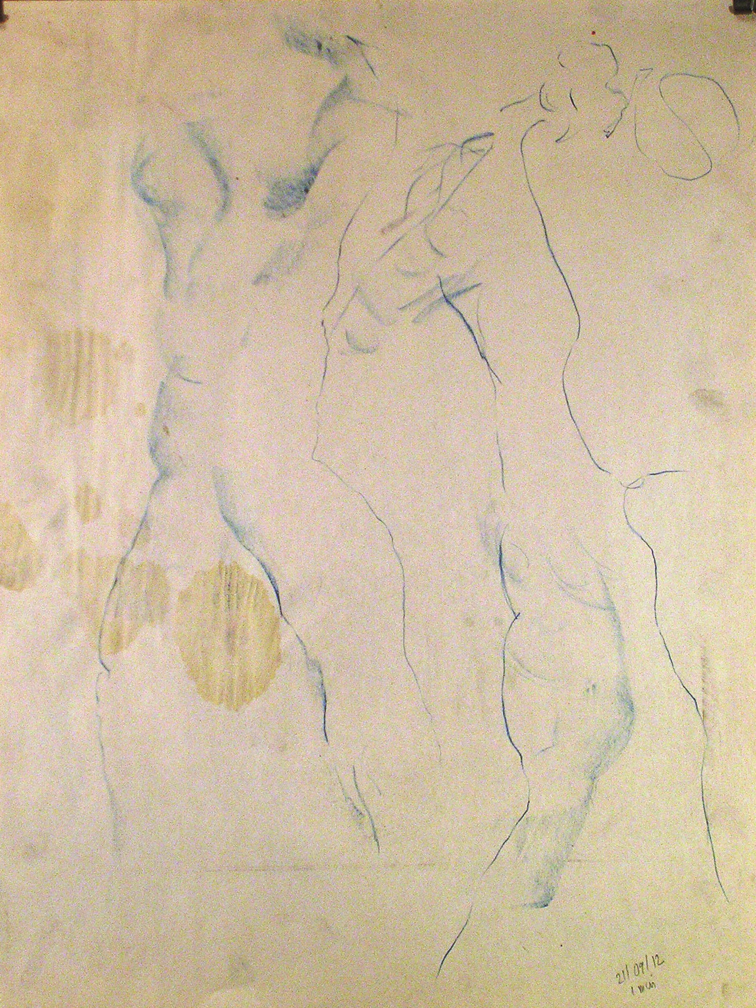 Why stop experimenting with gouache, I did remember art classes taken a long time ago, life model drawings with a strong accent on mixtes techniques, basically mixing all kind of mediums and sketching models….and I had those sketches that, well did not think much of them, it does happen, it is not always stellar works….so I decided to add gouache and watercolor, to add some life to them. And since usually I use three kind of paper, newsprint, manilla and kraft (not at all related to the company that make peanut’s butter…:)), I tried it on each of them, I like the results, so I guess that in the next sessions I will add those bigs gouache tubes, the small watercolor tubes to my usual drawing kit for these ‘ateliers’. The results just below…